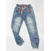 Riflové kalhoty s pohodlnou gumou v pase, kapsy na zip s oranžovou ozdobou, kkterá lze sundat. Nohavice dole do manžety.