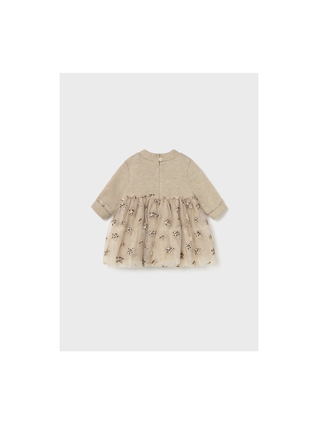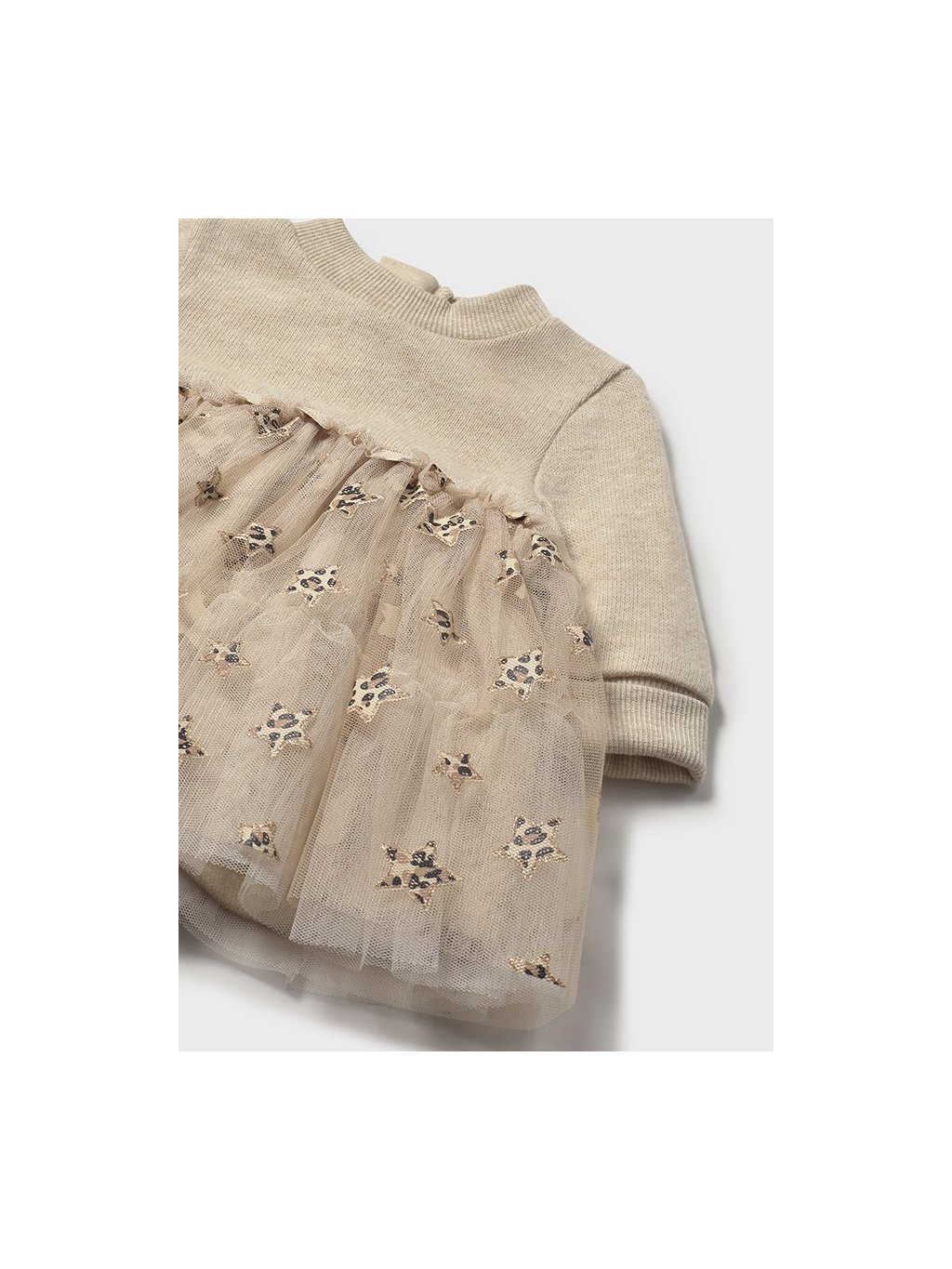 Zdobené zlatým potiskem , kojenecké šaty s tylovou sukýnkou. Zapínání na zádech. Vrchní díl přízový.